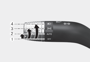 조명 스위치의 끝을 잡고 돌려 조명을 켜거나 끌 수 있다. 1번은 조명 꺼짐, 2번은 자동 켜짐, 3번은 미등 켜짐, 4등은 전조등 켜짐 스위치이다. AUTO 자동 켜짐 스위치는 센서가 외부의 밝기 정도를 감지하여 조명을 자동으로 조절한다.