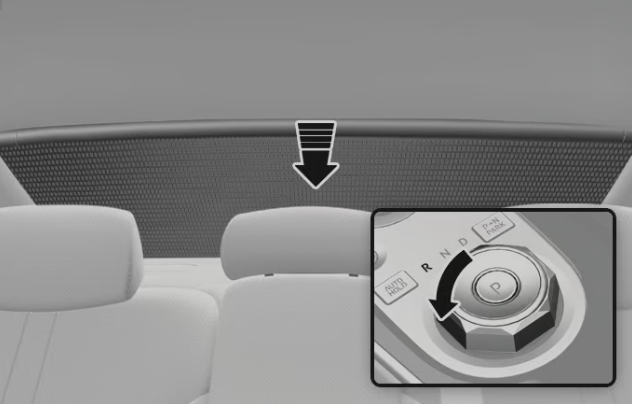 리어 커튼 버튼을 누르면 올라가고 다시 누르면 내려갑니다. 운전자가 변속 다이얼을 후진 R단으로 변속하면 커튼이 완전히 내려가 차량 뒤쪽을 쉽게 확인할 수 있습니다.