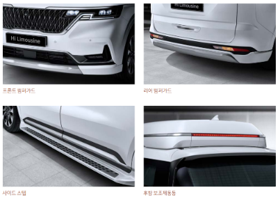 카니발 하이리무진은 하이루프, 후방 보조제동등, 프런트 범퍼가드, 리어 범퍼가드, 사이드 에어댐이 추가 적용됩니다.