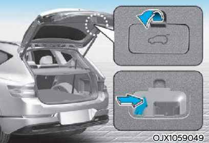 테일게이트 내부 하단에 있는 열림 장치 커버를 분리한다. 걸쇠를 화살표 방향으로 밀어 잠금을 해제할 수 있다. 잠금을 해제한 후 테일게이트를 밀어 열 수 있습니다.