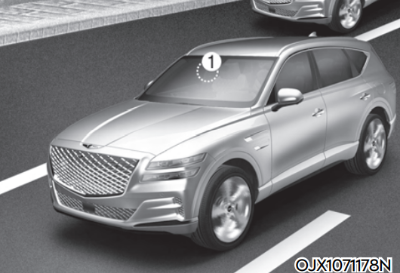 제네시스 GV80 기본 모델은 ① 전방 카메라, ② 전방 레이더, ④ 후측방 레이더가 적용 됩니다.