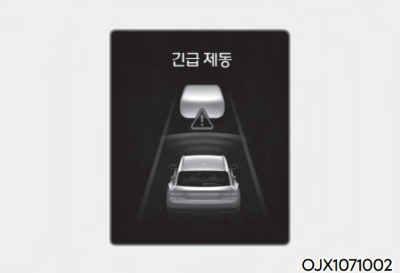 긴급 제동에 의한 정차 시 계기판 등에 경고문이 표시됩니다. 안전을 위해 즉시 브레이크 페달을 밟고 주변 상황을 확인해야 합니다. 정차는 약 2초 동안 유지되며 이후 제동 제어가 종료됩니다.
