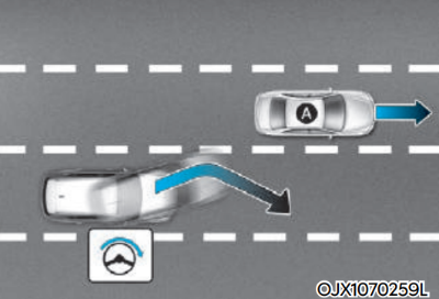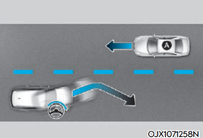 추월 시 대향차 대응 기능은 차로변경 시 맞은편에서 다가오는 차량과의 충돌 위험이 판단되면 충돌하지 않도록 회피 조향을 돕습니다.