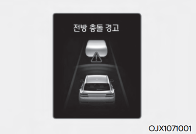 경고문, 경고음, 스티어링 휠 진동을 통해 전방 충돌 경고를 알립니다. 설정 메뉴에서 충돌방지 보조를 선택한 경우 전방 충돌 경고가 발생했을 때 제동 제어가 함께 작동할 수 있습니다.