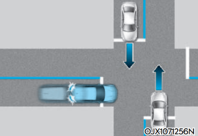 전측방 레이더를 통해 좌우측 전방의 차량을 인식할 수 있습니다. 이를 통해 전방 충돌방지 보조에 아래와 같이 다양한 기능이 추가 적용됩니다.