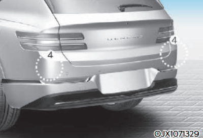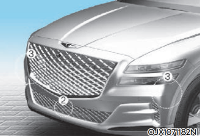 제네시스 GV80 기본 모델은 ① 전방 카메라, ② 전방 레이더, ④ 후측방 레이더가 적용 됩니다. 드라이빙 어시스턴스 패키지 2 옵션을 추가할 경우 ③ 전측방 레이더 2개가 추가 적용됩니다.