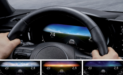 또한, 10.25인치 내비게이션 옵션 (95만 원) 선택 시 테마형 클러스터 기능이 지원되어 날씨(맑음, 흐림, 비, 눈), 시간 등의 환경 변화에 따라 자동적으로 화면이 바뀌어 운전의 즐거움과 몰입감을 높여줍니다.