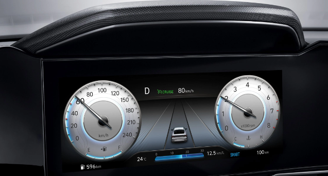디지털 클러스터와 내비게이션이 끊김 없이 이어진 ‘파노라마 디스플레이’는 운전자 쪽으로 10도 기울어져 편리한 조작감과 하이테크 한 감성을 제공한다. 또한 10.25인치 고해상도 TFT LCD를 적용하여 시인성을 향상시키고, 대화면 클러스터를 통해 차량 및 주행정보를 차별화된 콘텐츠로 제공한다.