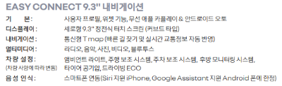 9.3인치 내비게이션은 7인치 디스플레이 오디오보다 다양한 기능을 포함한다. 또한 7인치 TFT 클러스터로 세련된 내장 디자인이 적용된다. 이 외에도 다양한 지능형 안전 기술과 편의 기능이 적용되어 운전자가 안전하고 편안한 주행이 가능하도록 돕는 옵션이다.