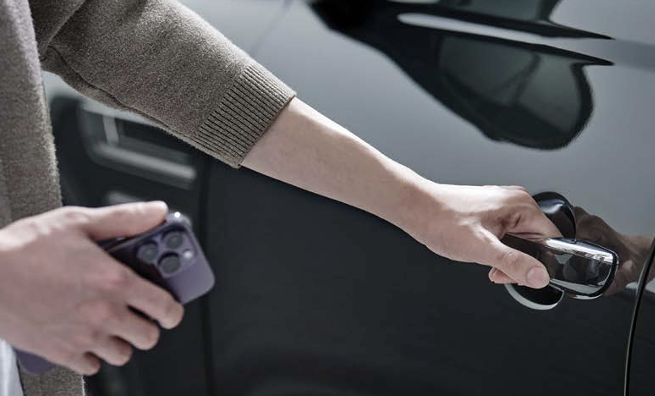 UWB 지원 스마트폰은 운전자가 스마트폰을 휴대한 상태에서 도어 핸들에 있는 잠금 / 잠금 해제 센서부(음각)를 터치하면 도어가 잠금 또는 잠금 해제 됩니다.
