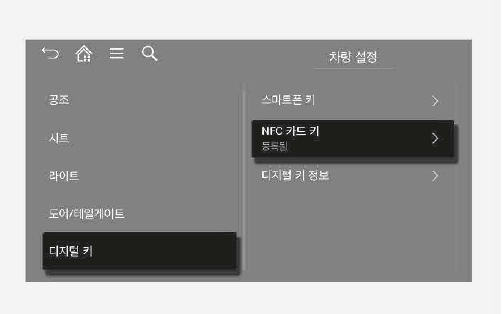차량 전원을 켠 상태에서 등록하려는 NFC 카드 키를 실내 인증 패드에 올려놓습니다. 인포테인먼트 시스템에서 설정 → 차량 → 디지털 키 → 카드 키 → 등록을 선택하여 카드 키를 등록합니다.