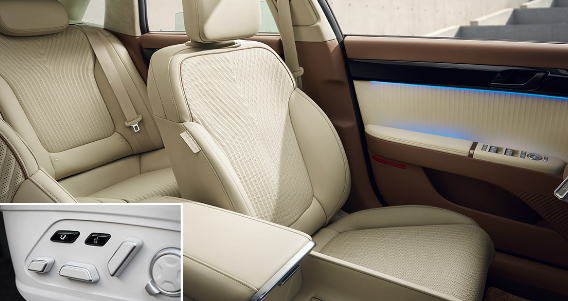 K8은 노블레스 및 시그니처 트림에서 컴포트 110만 원 옵션을 통해 에르고 모션 시트, 앞좌석 릴렉션 시트, 후진 연동 자동하향 아웃사이드 미러 등의 시트 편의 기능을 추가할 수 있다.