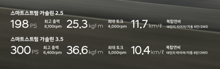| 가솔린 2.5 | 304마력 | 10.8km/ℓ | 198마력 | 11.7km/ℓ |