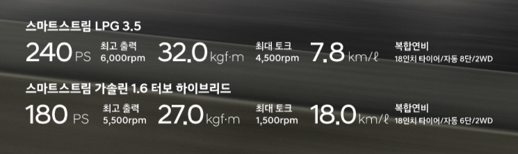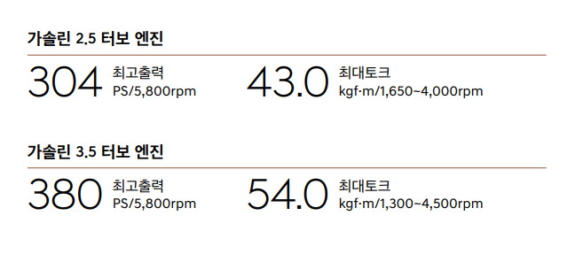 | 가솔린 3.5 | 380마력 | 9.2km/ℓ | 300마력 | 10.4km/ℓ |