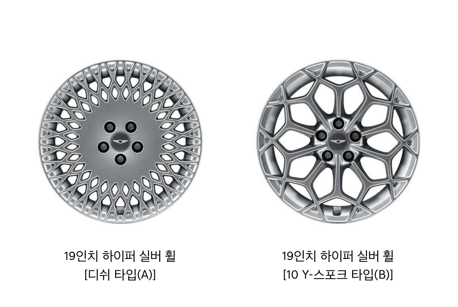 제네시스 G80에는 18인치 피렐리 타이어 & 다이아몬드 커팅 휠이 기본 적용되며 디올뉴 그랜저 캘리그래피 트림과 동일한 19인치를 적용하기 위해서는 120만 원으로 19인치 콘티넨탈 타이어 & 하이퍼 실버 휠, 전륜 모노블럭 (4P) 브레이크 옵션을 추가해야 한다.