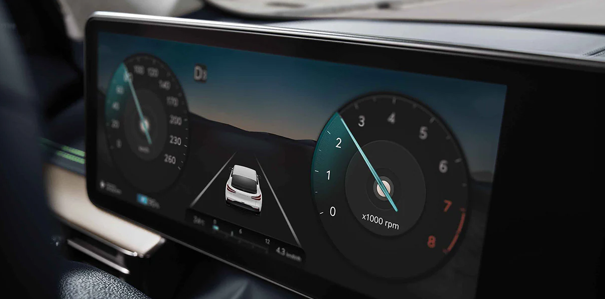 클러스터에 가상의 변속 단수와 엔진 회전수를 표시하여 전기차에서 가솔린 엔진의 가속감을 느낄 수 있게 하는 기능입니다. 액티브 사운드 디자인 기능과 더불어 내연기관 차량의 변속 느낌을 연출하기 위해 모터를 제어합니다.