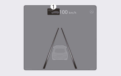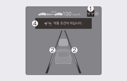 ① 고속도로 주행 보조 표시등 : 초록색 작동 상태, 회색 대기 상태, 흰색 점멸 가속 페달을 밟은 상태, 미표시 꺼짐 상태