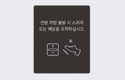 만약, 30초가 지나거나 일반 도로에서 스마트 크루즈 컨트롤 기능을 사용한다면 클러스터 표시창에 위 안내문이 표시됩니다. 다시 출발하려면 가속 페달을 밟거나, + 또는 - 스위치를 올리거나, 일시정지 스위치를 누르면 됩니다.