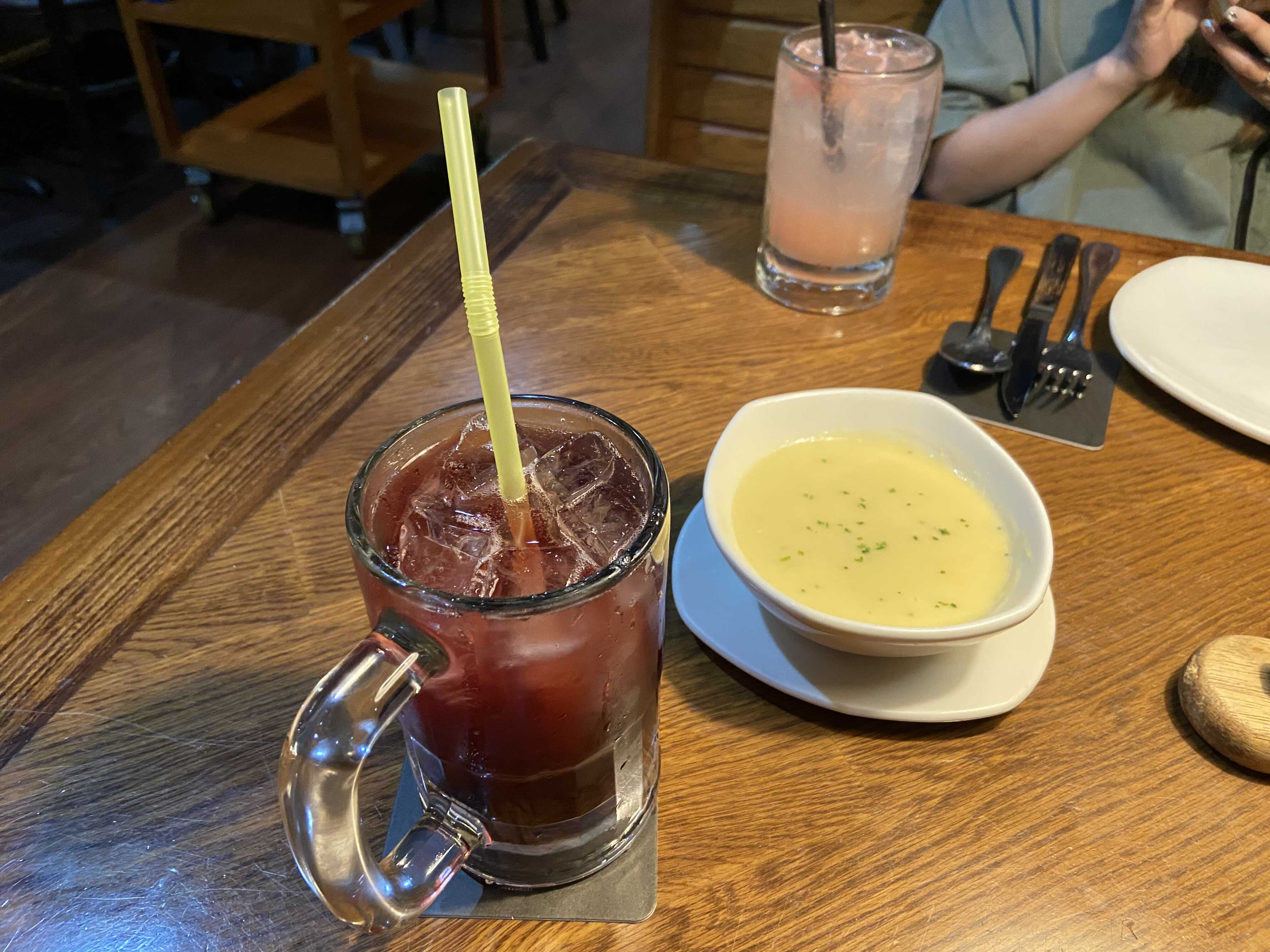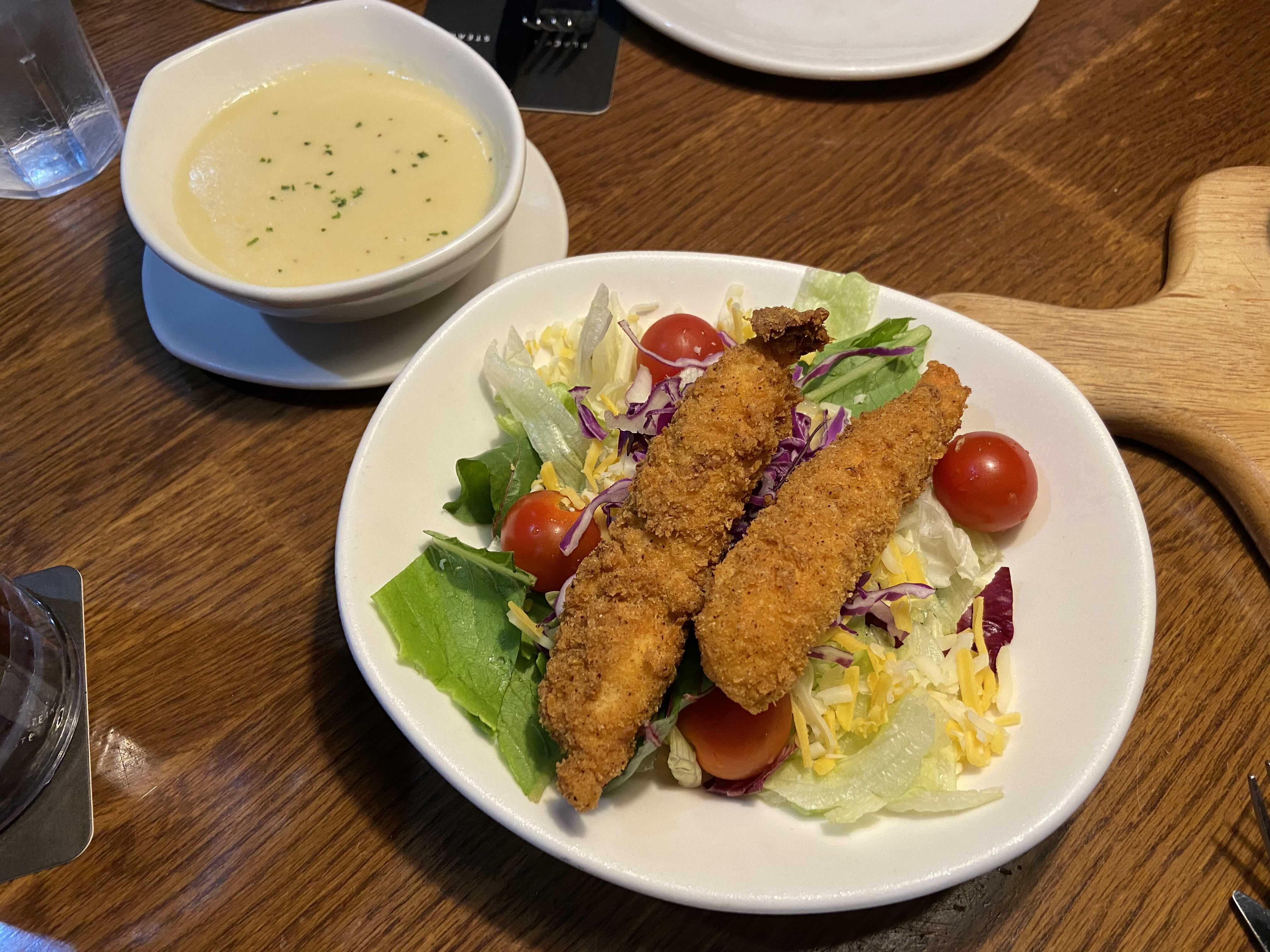 런치 메뉴는 메인 메뉴 1개와 스프 1개가 포함되어 있다. 이 스프를 샐러드로 바꿀 수 있다. 스프를 샐러드로 교환하는데 1,300원 추가하면 된다. 여기에 치킨 텐더를 2~3개 추가하면 치킨 샐러드가 된다. 치킨 텐더는 1조각에 2,600원이다. 게 하면 치킨 샐러드 메뉴가 됩니다. 소스는 허니 머스타드 소스를 추천한다.