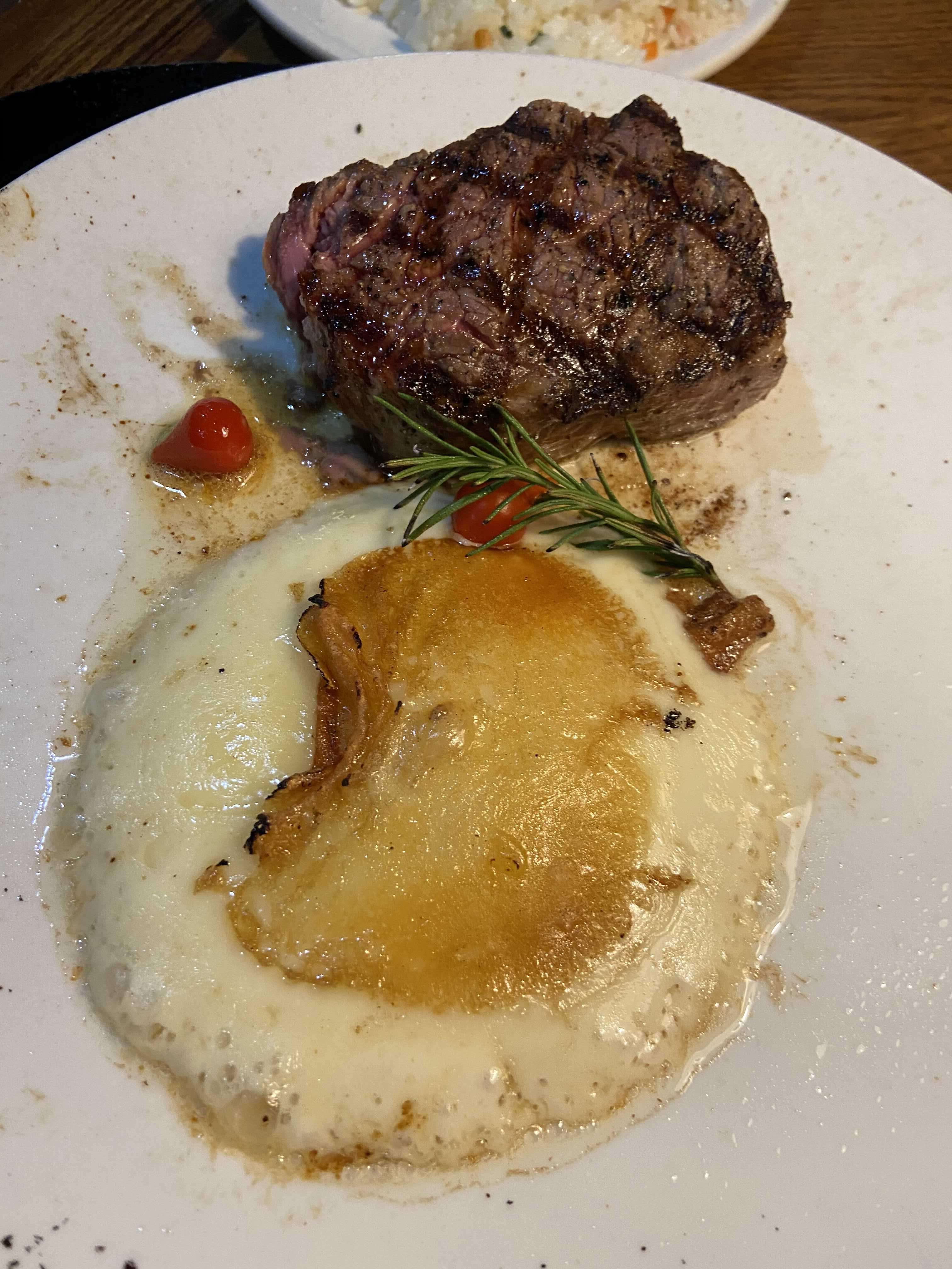 블랙라벨 메뉴는 스테이크, 사이드 메뉴 1, 치즈 3가지가 나온다. 이 스테이크의 특별한 점이 있는데 메뉴가 나오면 테이블 앞에서 치즈에 불을 붙여 녹여 스테이크와 함께 먹을 수 있다는 점이다. 치즈와 스테이크를 함께 먹으면 특이하지만 맛있다.