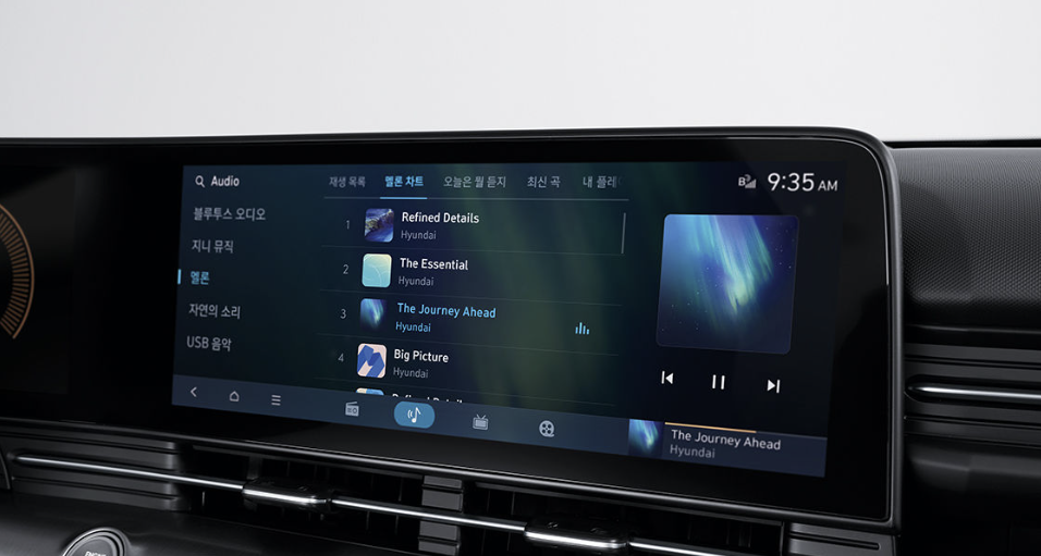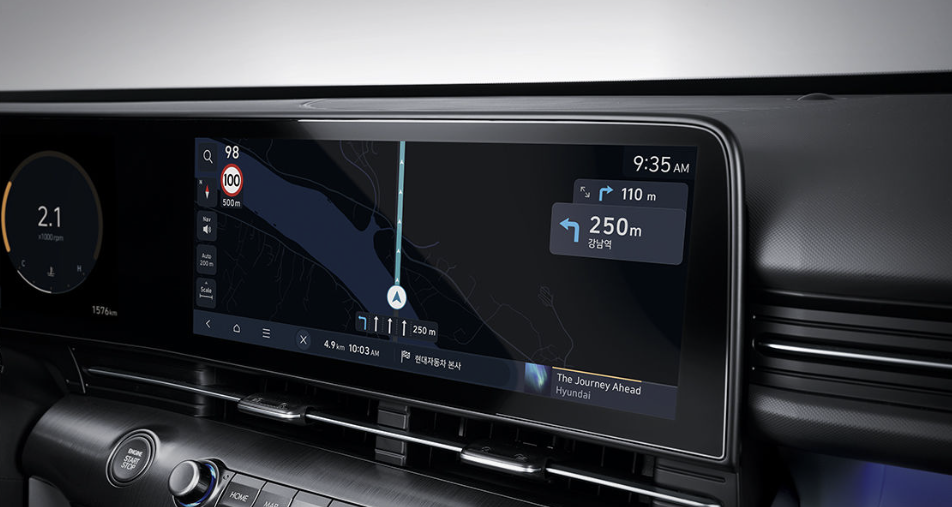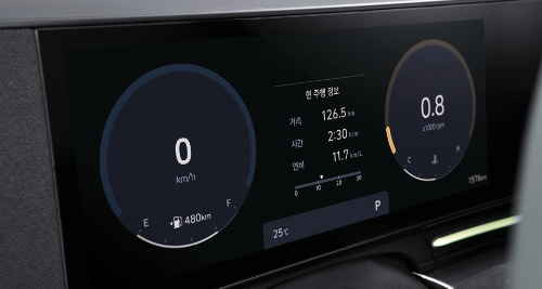 12.3인치 듀얼 와이드 디스플레이로 클러스터, 내비게이션, 헤드업 디스플레이 간 일체감 있는 그래픽 테마를 구현하고, 자연어 기반 음성인식, 미디어 스트리밍, 실시간 길 안내 등의 다양한 콘텐츠를 제공한다.