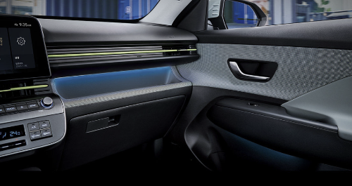 2023 디올뉴 코나 인스퍼레이션 트림 내장은 12.3인치 컬러 LCD 클러스터, 앰비언트 무드램프가 적용된다.