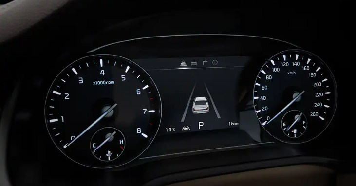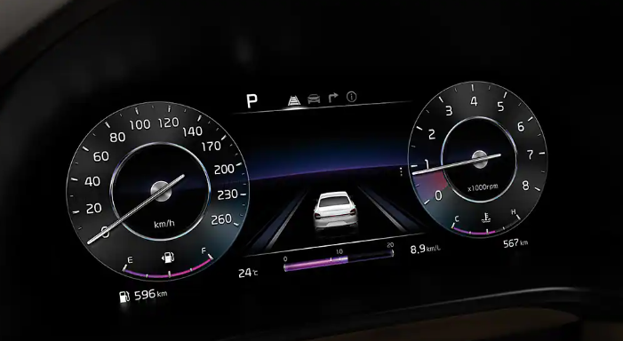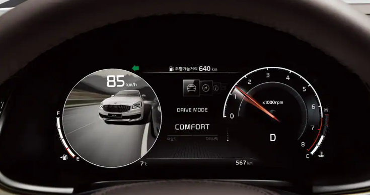 K9 플래티넘 트림은 7인치 슈퍼비전 클러스터가 기본 적용된다. 좌측은 RPM, 엔진 온도계가 우측은 속도계, 연료량이 아날로그 방식으로 표시된다. 가운데 부분의 7인치 LCD 창을 통해 첨단 운전자 보조 기능의 작동, 차량 정보 등 다양한 정보가 표시된다.