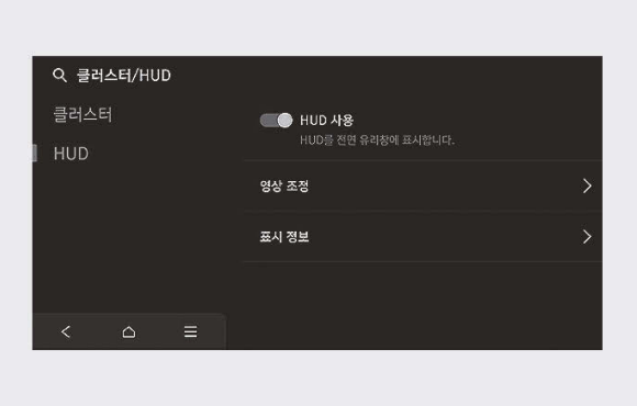 시동이 켜진 상태에서 인포테인먼트 시스템의 설정 → 차량 → 클러스터/HUD → HUD → HUD 사용을 선택하면 헤드업 디스플레이가 켜집니다. 헤드업 디스플레이 기능을 켜면 영상 조정 및 표시 정보를 변경할 수 있습니다.