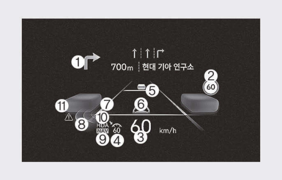 앞 유리창에 선팅 필름을 붙일 경우 영상이 잘 보이지 않을 수 있습니다. 헤드업 디스플레이에 표시되는 후측방 안전 시스템은 보조 시스템이므로 차로 변경할 때 반드시 주위를 확인하는 것이 좋습니다.