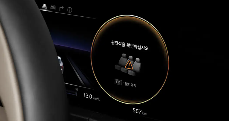 후석 승객 알림은 운전자가 하차 후 차량 도어 잠금 시 레이더 센서가 실내 움직임을 감지하면, 경적 및 UVO 문자 메시지 등으로 운전자에게 경고를 해주는 기능이다.