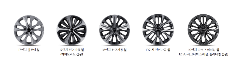 19인치 다크 스퍼터링 휠은 2.5 가솔린 시그니처 스페셜 트림 및 3.5 가솔린 플래티넘 트림에서만 적용되며, 터보 하이브리드 모델 시그니처 스페셜 트림은 시그니처 트림과 동일한 18인치 미쉐린 타이어 & 전면가공 휠이 적용된다.