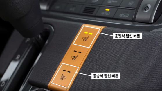 열선 시트는 시동이 걸린 상태에서 해당 좌석 히터 스위치를 누르면 강약조절 표시등이 켜져 사용 중임을 나타내고 해당 좌석이 따뜻해집니다.