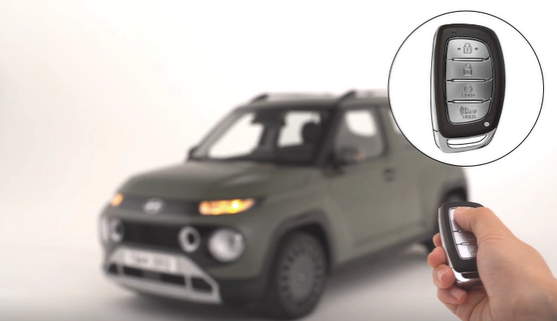 2023 캐스퍼 디 에센셜 라이트 트림에는 스마트키가 적용되어 스마트키를 이용하여 원격 시동을 걸 수 있습니다. 차량과 10m 이내에서 도어 잠금 버튼을 누른 후 4초 이내에 원격 시동 버튼을 2초 이상 누르면 시동이 걸립니다. 원격 시동 버튼을 추가로 1회 누르면 시동이 꺼집니다.