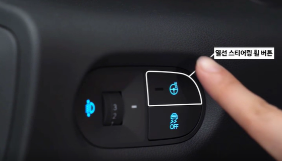 열선 기능은 시동이 켜진 상태에서 스티어링 휠 히터 버튼을 누르면 버튼에 불이 켜지며 스티어링 휠이 따뜻해집니다. 버튼을 다시 누르면 꺼지고 작동이 멈춰 사용하기에 간편합니다.