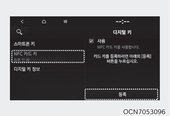차량의 시동이 켜진 상태에서 등록하려는 카드 키를 실내 인증 패드(무선 충전 패드)에 올려놓고 인포테인먼트 시스템의 설정 → 차량 → 디지털 키 → 카드 키 → 등록을 선택하여 카드 키를 등록합니다.