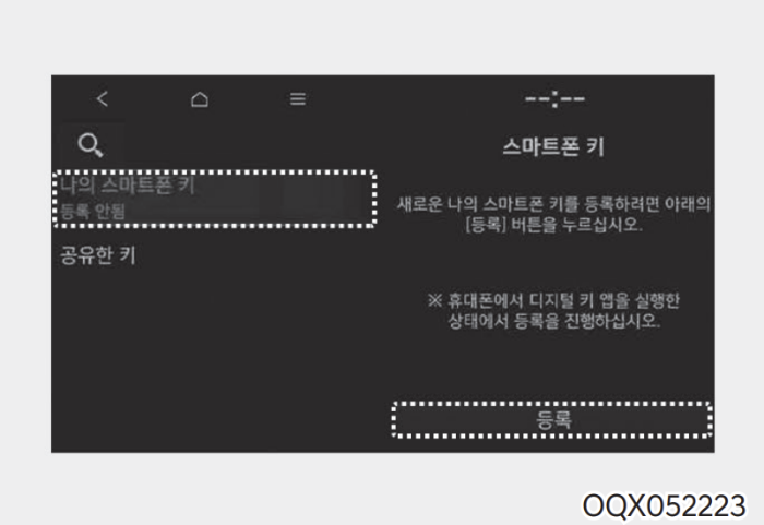 인포테인먼트 시스템에서 설정 → 차량 → 디지털 키 → 스마트폰 키 → 나의 스마트폰 키를 선택하여 등록 화면으로 이동합니다.