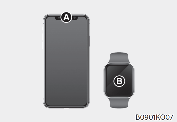 스마트폰의 NFC 안테나 위치가 실내 인증 패드 (무선 충전 패드) 위에 접촉되도록 합니다. 애플 아이폰 NFC 안테나는 기기 후면 최상단 A, 애플 워치 NFC 안테나는 화면 중앙 B에 위치합니다.