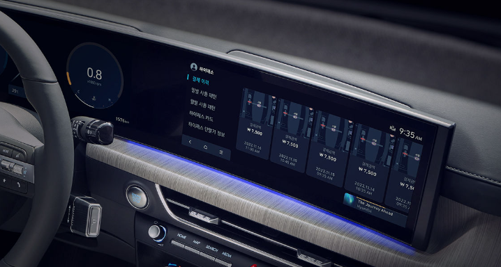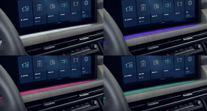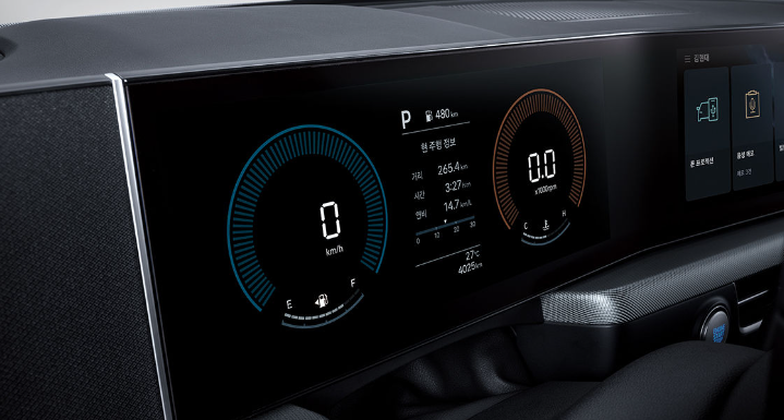 또한 파노라믹 커브드 디스플레이가 적용되어 클러스터와 AVN 화면 일체형의 와이드 한 커브드 디스플레이 하단에 무드 조명을 적용하여 미래지향적인 분위기를 느끼실 수 있습니다.