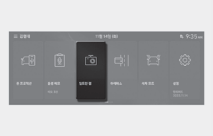 인포테인먼트 시스템 홈 화면에서 빌트인 캠을 선택하면 빌트인 캠 영상 확인 등 다양한 작업 수행이 가능합니다. 인포테인먼트의 빌트인 캠 메뉴를 사용 중에는 녹화 기능이 작동하지 않습니다.