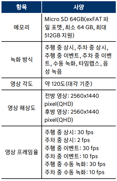 • 자동 녹화 영상: 주행 중 상시, 주차 중 상시, 주행 중 이벤트, 주차 중 이벤트