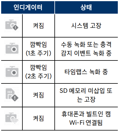 주차 중 녹화 기능이 설정되어 있으나 주차 녹화 설정 시간이 초과된 경우, 주차 중 녹화 기능이 설정되어 있으나 주차 보조 배터리 충전량이 부족한 경우, SD 메모리 수명이 다했거나 고장으로 녹화를 할 수 없는 경우에는 녹화 기능이 작동 중지됩니다.