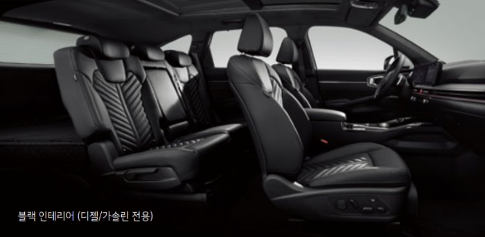 | 6인승 | 84만 원 | 2열 독립시트(슬라이딩, 리클라이닝), 2열 윙아웃 헤드레스트, 3열 시트(5:5 폴딩, 유아용 시트 고정 장치), 2열 원터치 워크인, 후석 매뉴얼 에어컨(후석 보조 에어컨 필터 포함), C타입 USB 단자(충전용, 3열 2개) |