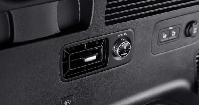 3열 에어컨에서 풍량 조절 노브를 돌려 원하는 풍량으로 설정하면 앞 좌석과는 다르게 독립적으로 풍량을 조절할 수 있습니다. 러기지 트림 오른쪽에 장착된 뒷좌석 매뉴얼 에어컨용 에어필터는 실내 먼지를 걸러줍니다.