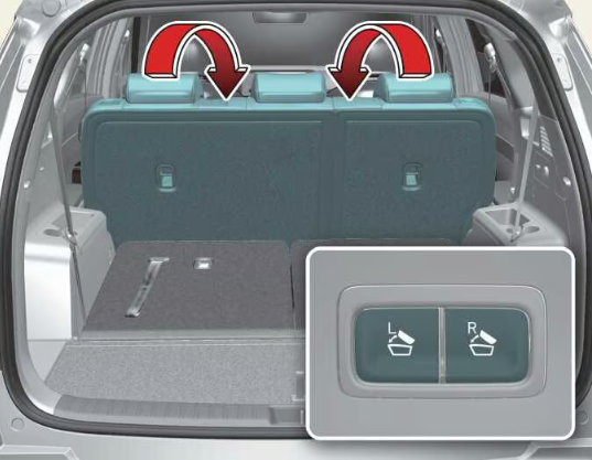 위 그림과 같이 트렁크를 연 상태에서 버튼을 눌러 2열 좌석을 손쉽게 접을 수 있습니다. 큰 사이즈의 화물 적재 시 원터치 폴딩 기능을 활용하면 수납이 원활하고 쉽게 트렁크 공간을 확장할 수 있습니다.