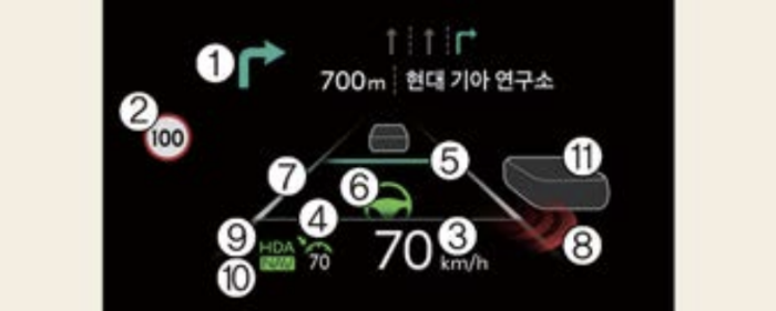 운전자가 하단의 계기판이나 중앙의 내비게이션을 보는 것보다 전방을 주시하며 헤드업 디스플레이를 통해 차량 및 주행 관련 다양한 정보를 쉽게 확인할 수 있어 운전자의 편의 향상 및 안전사고 예방에 큰 도움이 되는 기능입니다.