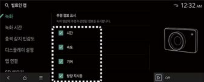 빌트인 캠 영상에 다양한 주행 정보를 기록할 수 있으며, 원하는 항목을 운전자가 직접 선택할수 있습니다.