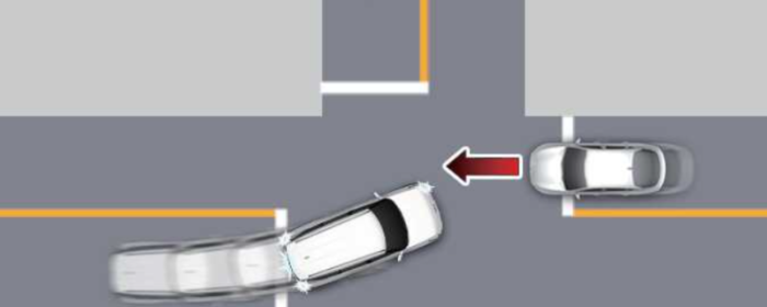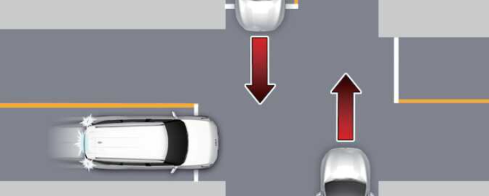 운전자가 교차로에서 방향지시등 스위치를 내린 상태에서 좌회전할 때 맞은편 차로에서 차량과의 충돌 위험이 판단되면 브레이크를 제동 하거나 회피하도록 돕습니다.