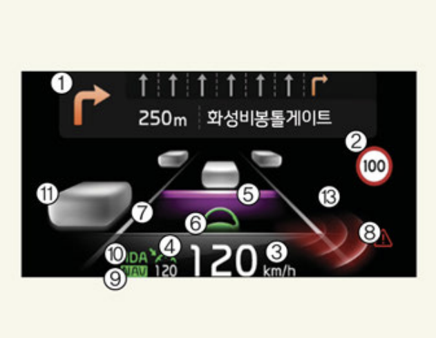 ① 내비게이션 표시 ② 도로 정보 표시 ③ 차량 속도 표시 ④ 스마트 크루즈 컨트롤 설정속도 표시 ⑤ 스마트 크루즈 컨트롤 차간거리 표시 ⑥ 차로 유지보조 표 ⑦ 차로 안전 표시 ⑧ 후측방 안전 표시 ⑨ 고속도로 주행속도 자동 조절 표시 ⑩ 고속도로 주행 보조 표시 ⑪ 주변 차량 표시 |