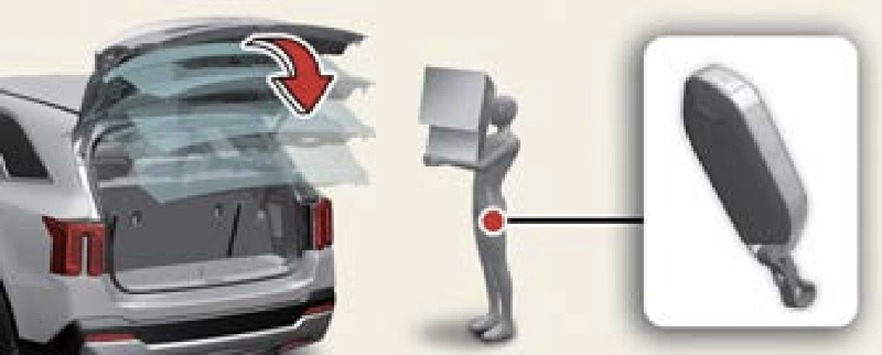 모든 도어가 닫혀 잠겨 있는 상태에서 약 15초 이후, 운전자가 스마트키를 휴대하고 테일게이트 후방 감지 영역 약 50~100 cm 이내에 접근하여 3초 이상 대기하면 테일게이트가 자동으로 열립니다.