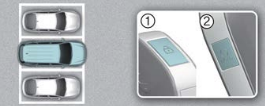 시동이 켜진 상태에서는 원격 전/후진 기능을 사용하려는 공간 앞에 차량을 정렬한 후 ① 주차단으로 변속합니다. 운전자는 실내에서 ② 주차 / 뷰 버튼을 길게 눌러 원격 스마트 주차 보조 기능이 작동 준비 상태로 만들 수 있습니다. 후에 운전자는 스마트 키를 휴대한 상태에서 차에서 내린 후 모든 도어 및 테일게이트를 닫습니다.